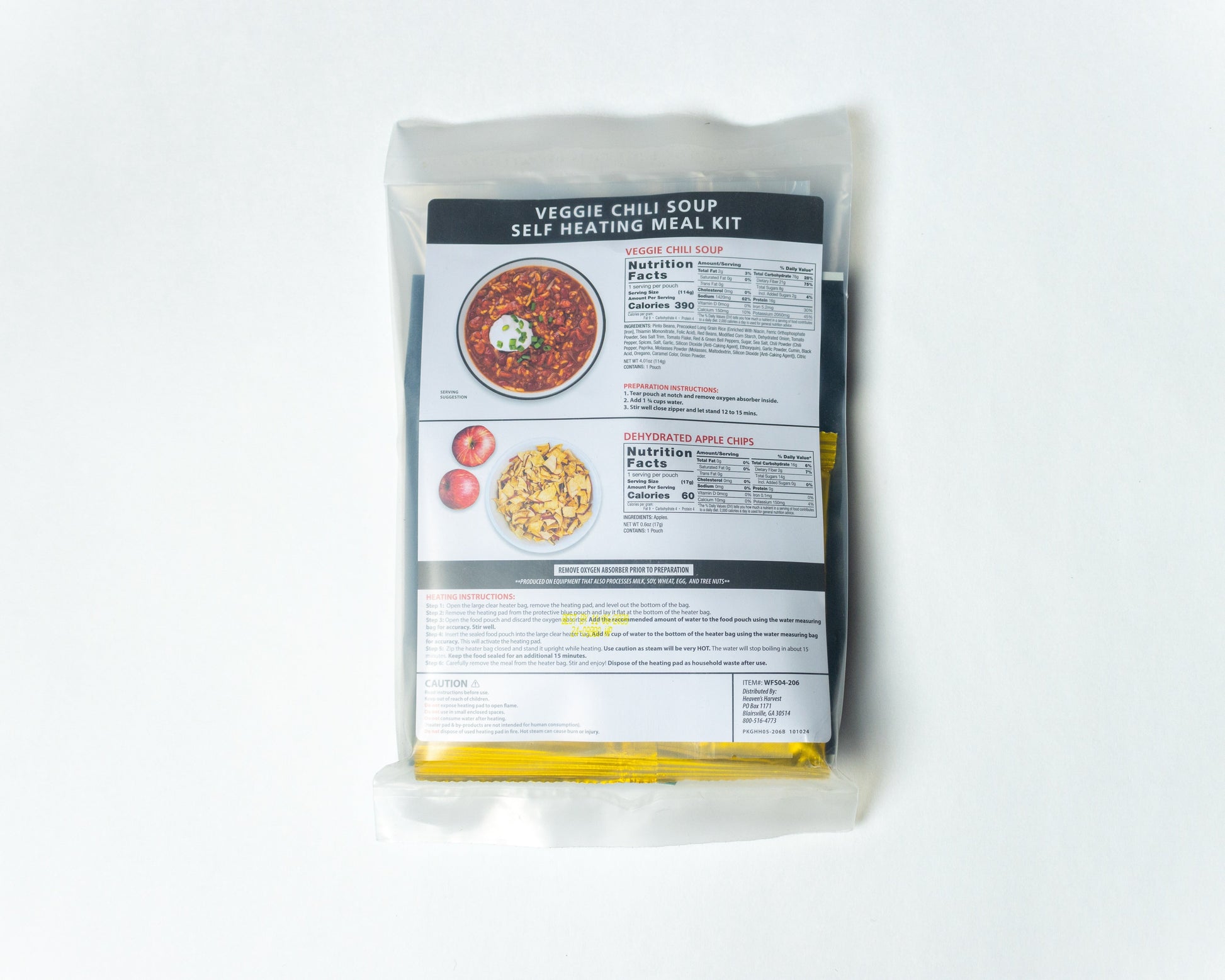 Each Self Heating Meal kit is equipped with all items necessary to warm and heat a single meal! Both the Veggie Chili Soup and apple chips are packaged in a mylar foil bag to deflect any pests, moisture, or light. The only item you need is 1-3/4 cups of water.
