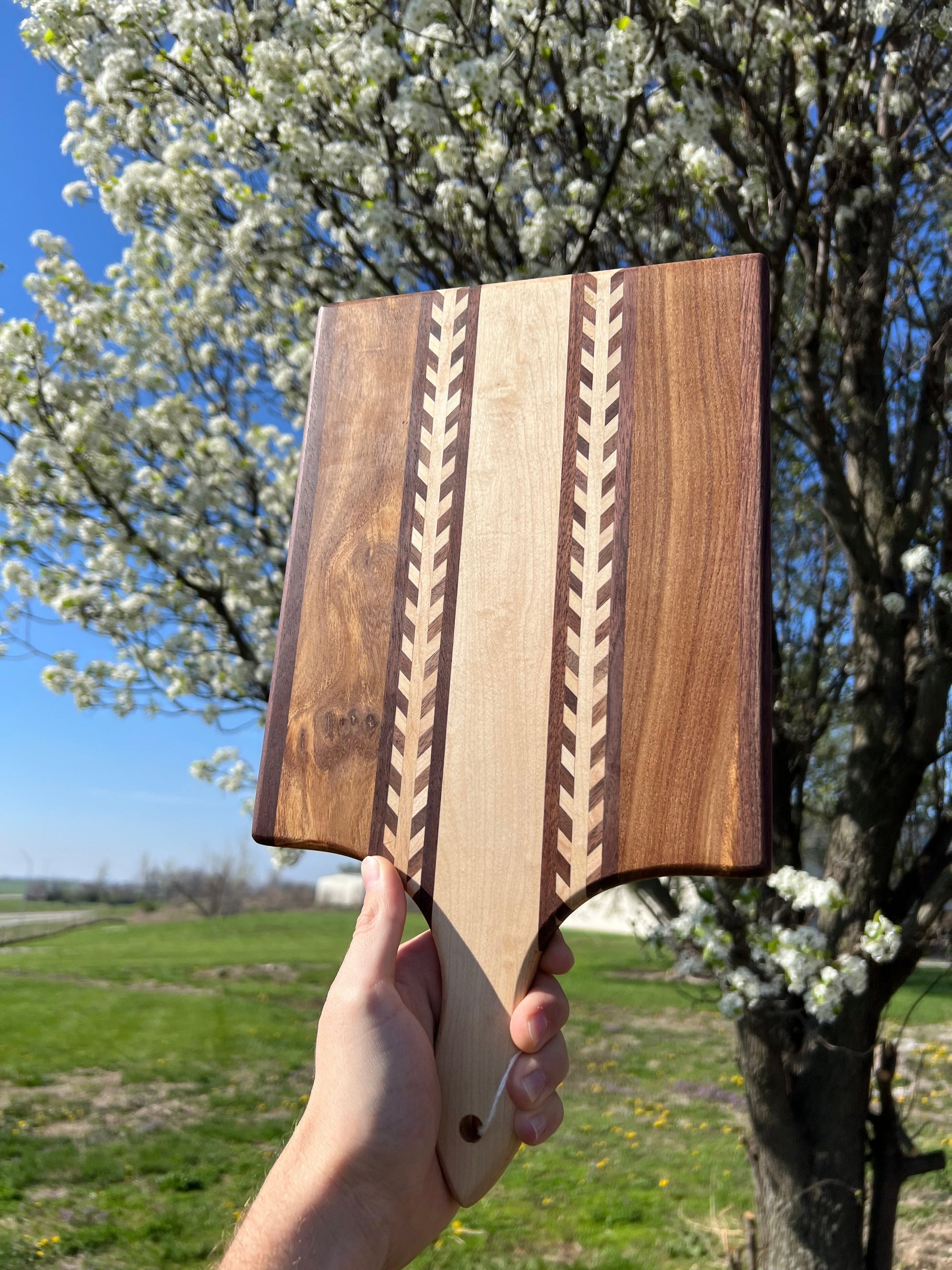 Amish Handmade "Wheat Inlay" Cutting Board - Mixed Hardwood Paddle