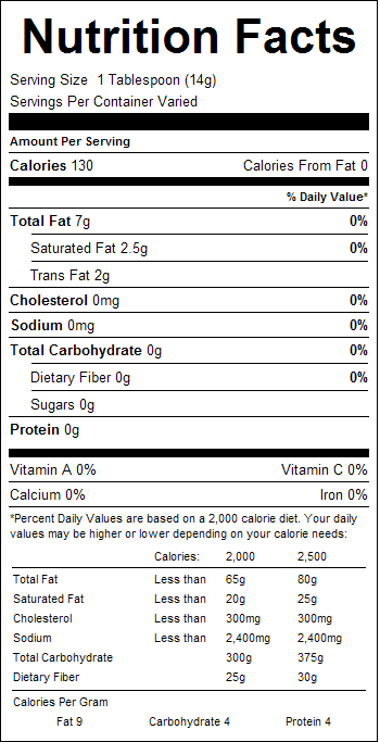Ingredients: Partially hydrogenated soybean oil with artificial butter flavor, TBHQ and citric acid added to improve stability, beta carotene for color, methyl-silicone added as an anti-foaming agent. **This product was processed in a facility that uses nuts and/or nut products.