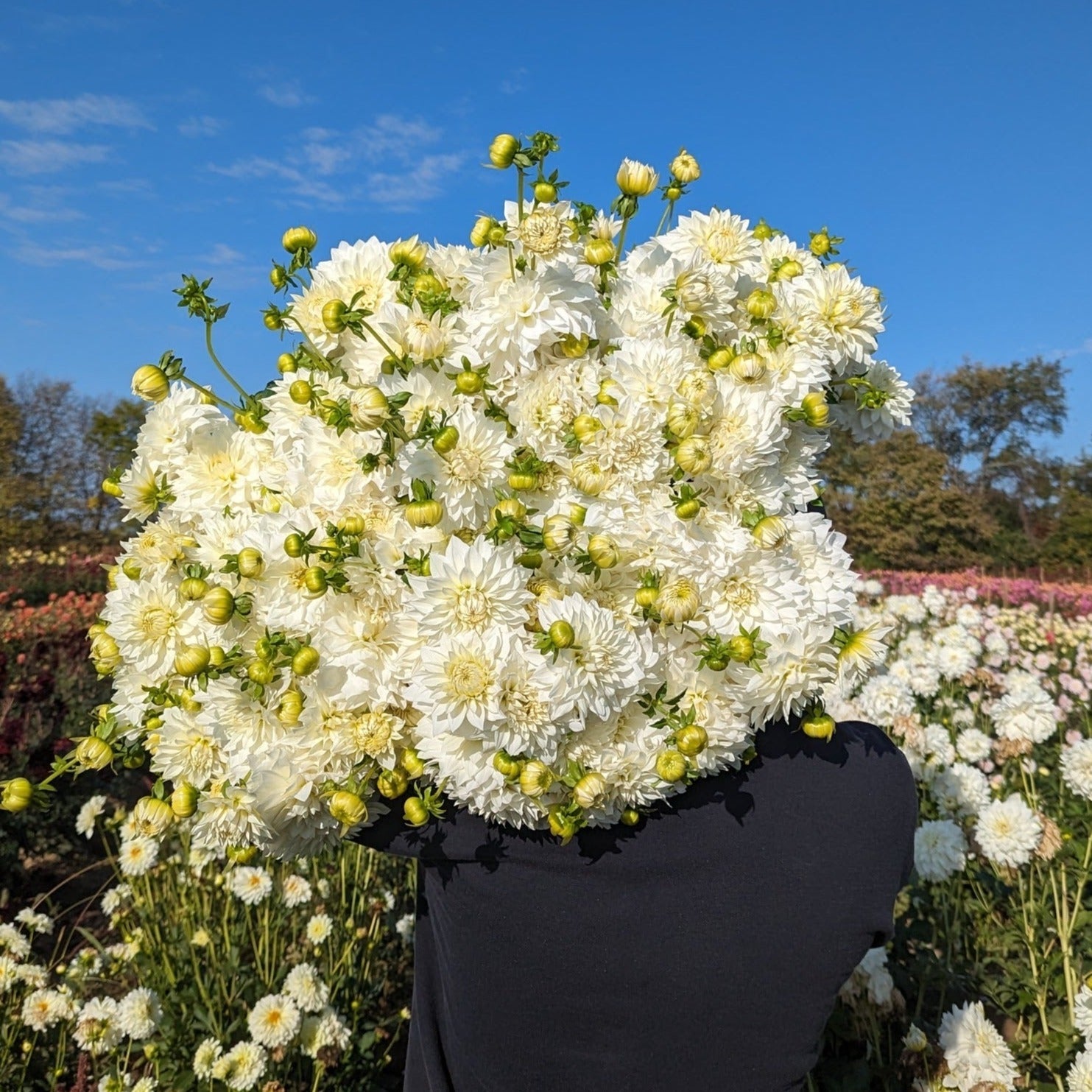 An upward facing medium-large flat style dahlia, blooms about 4-5" & 60-72" plants. This is a great one for wedding work to give you a different shape besides ball dahlias and they don't hang their heads like other white dinnerplates. On nice sturdy stems and the petals start to curl backwards a bit once they are fully open. We can always sell all the cuts we can produce!