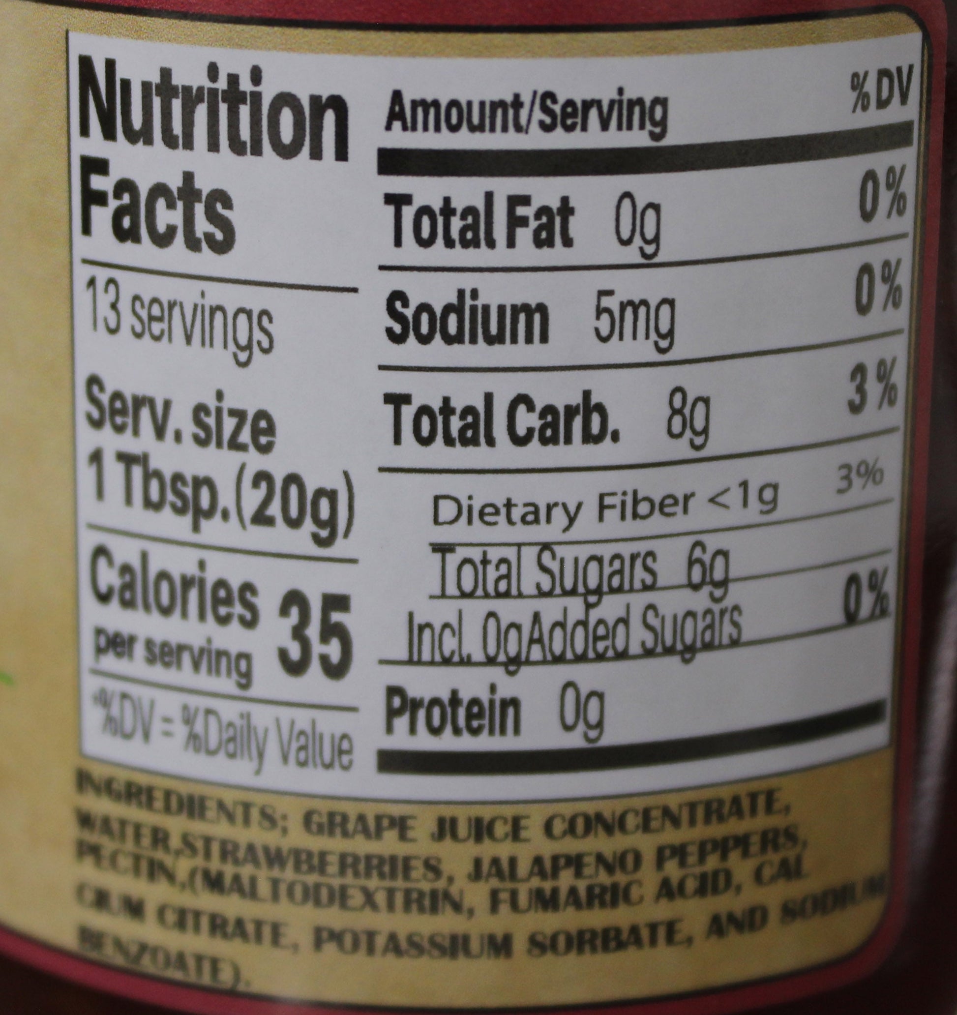 Ingredients: Grape juice concentrate, water, strawberries, jalapeno peppers, pectin.